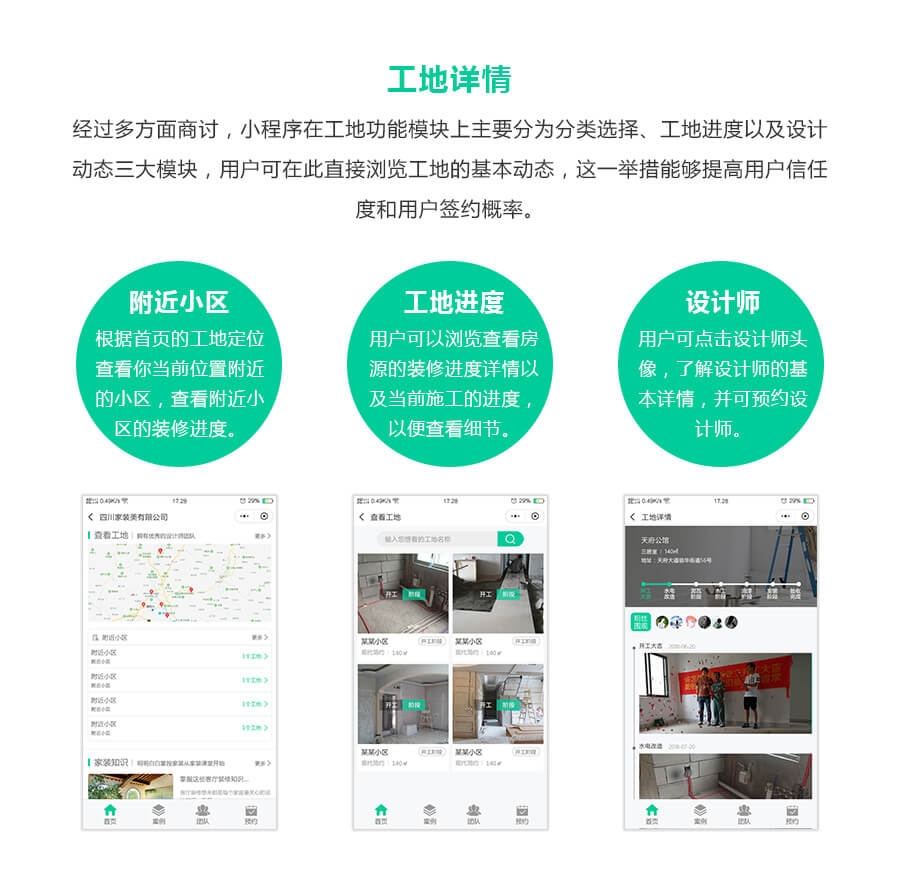 解决装修公司微信端快速传播营销的功能。公司设置,促销设置,小区设置,案例设置,团队设置,电话设置,可用VR展示,支持查看工地进度。