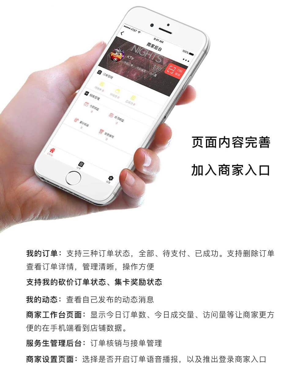 KTV微信小程序支持砍价、集卡、预约,商城。可预订任何包厢、酒水零食,所消费的总额可获得积分,积分兑换礼品,用户自定义;可以查看歌友发布的K歌信息,喜欢,评论,发布,互动交流...... 当前版本为连锁店版(商家手机端后台、店长手机端后台、服务生手机端后台)!
